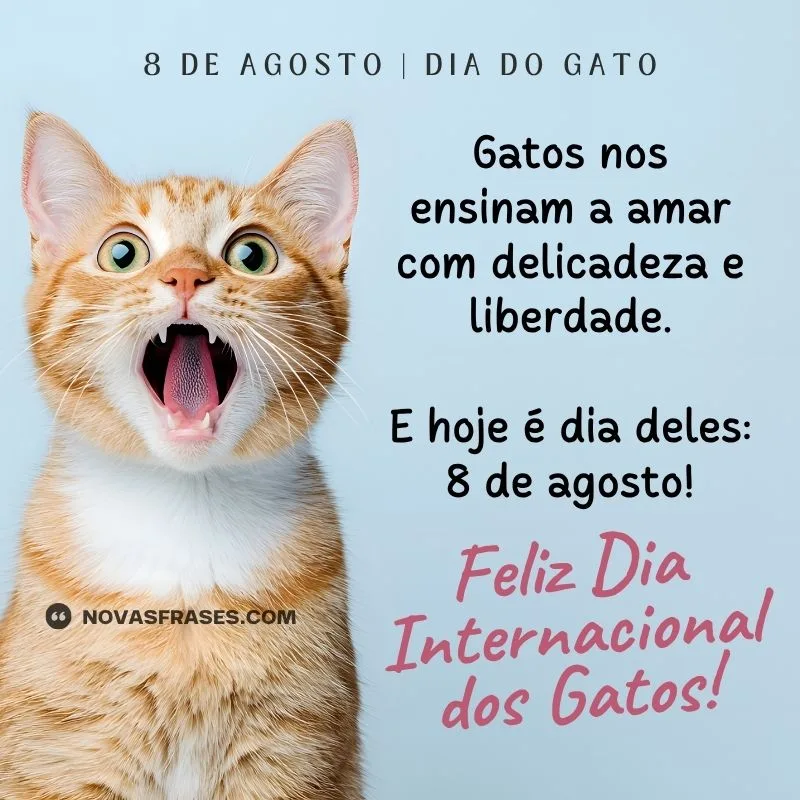 O Dia do Gato é comemorado em 8 de agosto e é o momento perfeito para homenagear esses companheiros cheios de charme, personalidade e fofura. Compartilhe uma mensagem do Dia Mundial do Gato com carinho e bom humor. Frases ideais para quem ama felinos e não resiste a um miado carinhoso.