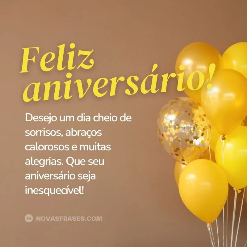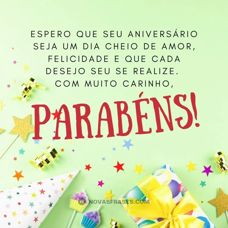 Que este dia traga novas oportunidades e muitas razões para sorrir. Com carinho, parabéns por mais um ano de vida! 🎂