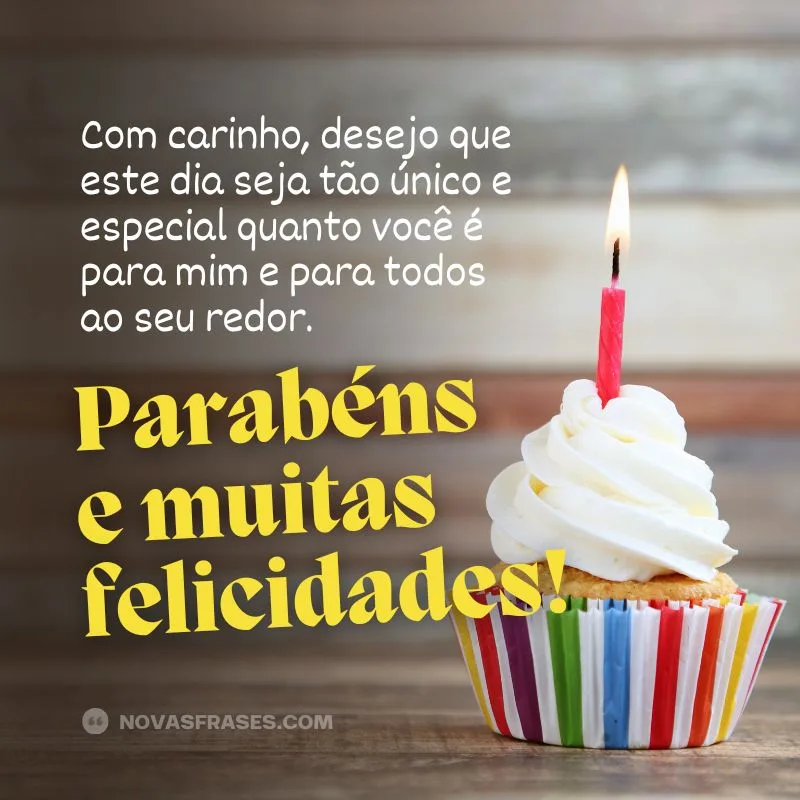 Com carinho, desejo que este dia seja tão único e especial quanto você é para mim e para todos ao seu redor. Parabéns e muitas felicidades! 💖
